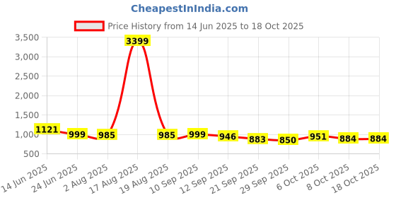 The current price is ₹884, which is ₹34 (4.0%) higher than the best price of ₹850 last seen on 29 Sep 2025. Over the 126 day price history period, prices have ranged from ₹850 to ₹3,399, with an average of ₹1,157. The pricing shows high volatility with significant fluctuations, and the overall trend is favorable for consumers as prices are getting cheaper. In terms of recent activity, there have been 0 price changes this week, 3 this month, and 10 over the past year. If you need this product now, it's a reasonable time to buy as prices are stable, but you might want to monitor for potential better deals.