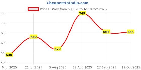 The current price is ₹655, which is ₹115 (21.3%) higher than the best price of ₹540 last seen on 6 Jul 2025. Over the 104 day price history period, prices have ranged from ₹540 to ₹749, with an average of ₹633. The pricing shows moderate volatility, but the overall trend is concerning as prices are getting more expensive. In terms of recent activity, there have been 0 price changes this week, 0 this month, and 4 over the past year. If you need this product now, it's a reasonable time to buy as prices are stable, but you might want to monitor for potential better deals.