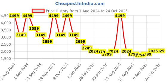 The current price is ₹2,025, which is ₹271 (15.5%) higher than the best price of ₹1,754 last seen on 31 Aug 2025. Over the 449 day price history period, prices have ranged from ₹1,754 to ₹4,499, with an average of ₹2,852. The pricing shows high volatility with significant fluctuations, and the overall trend is favorable for consumers as prices are getting cheaper. In terms of recent activity, there have been 0 price changes this week, 0 this month, and 15 over the past year. The price direction is uncertain, so monitor the situation for a few more days before making a decision.