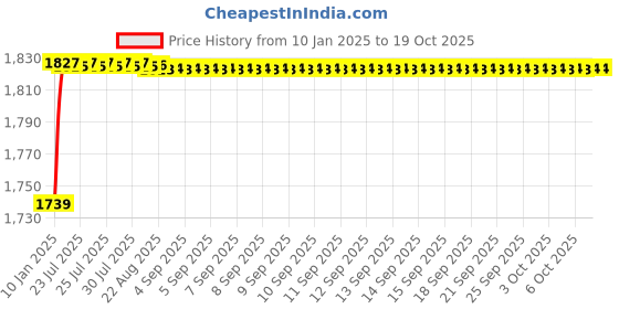 The current price is ₹1,824, which is ₹85 (4.9%) higher than the best price of ₹1,739 last seen on 10 Jan 2025. Over the 281 day price history period, prices have ranged from ₹1,739 to ₹1,827, with an average of ₹1,823. The pricing has been quite stable with low volatility, with prices remaining relatively stable overall. In terms of recent activity, there have been 0 price changes this week, 11 this month, and 61 over the past year. If you need this product now, it's a reasonable time to buy as prices are stable, but you might want to monitor for potential better deals.