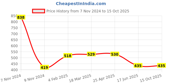 The current price is ₹435, which is ₹16 (3.8%) higher than the best price of ₹419 last seen on 9 Nov 2024. Over the 341 day price history period, prices have ranged from ₹419 to ₹838, with an average of ₹529. The pricing shows high volatility with significant fluctuations, and the overall trend is favorable for consumers as prices are getting cheaper. In terms of recent activity, there have been 0 price changes this week, 0 this month, and 5 over the past year. If you need this product now, it's a reasonable time to buy as prices are stable, but you might want to monitor for potential better deals.