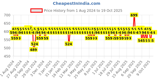The current price is ₹594, which is ₹105 (21.5%) higher than the best price of ₹489 last seen on 25 Sep 2024. Over the 443 day price history period, prices have ranged from ₹489 to ₹699, with an average of ₹596. The pricing has been quite stable with low volatility, with prices remaining relatively stable overall. In terms of recent activity, there have been 0 price changes this week, 8 this month, and 92 over the past year. If you need this product now, it's a reasonable time to buy as prices are stable, but you might want to monitor for potential better deals.
