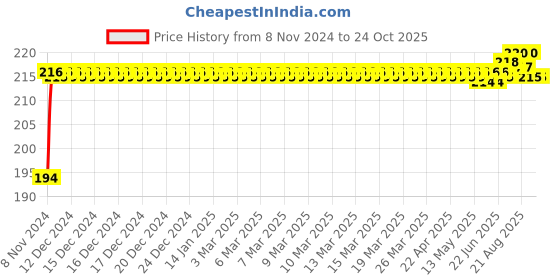 The current price is ₹215, which is ₹21 (10.8%) higher than the best price of ₹194 last seen on 8 Nov 2024. Over the 350 day price history period, prices have ranged from ₹194 to ₹220, with an average of ₹215. The pricing has been quite stable with low volatility, but the overall trend is concerning as prices are getting more expensive. In terms of recent activity, there have been 0 price changes this week, 0 this month, and 102 over the past year. If you need this product now, it's a reasonable time to buy as prices are stable, but you might want to monitor for potential better deals.