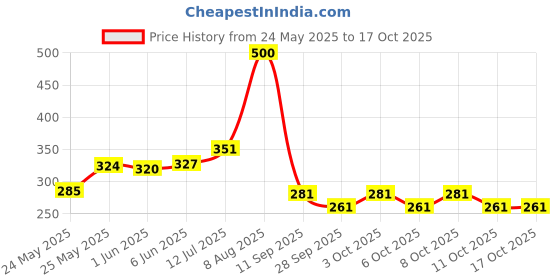 Fantastic! The current price of ₹261 is at its best ever level. Over the 145 day price history period, prices have ranged from ₹261 to ₹500, with an average of ₹307. The pricing shows high volatility with significant fluctuations, and the overall trend is favorable for consumers as prices are getting cheaper. In terms of recent activity, there have been 0 price changes this week, 4 this month, and 11 over the past year. If you need this product now, it's a reasonable time to buy as prices are stable, but you might want to monitor for potential better deals.