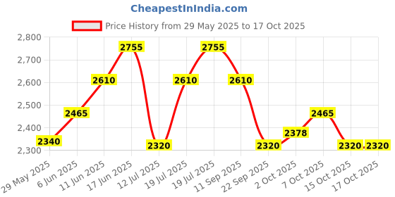 Good news! The current price of ₹2,320 is at its best ever level. Over the 140 day price history period, prices have ranged from ₹2,320 to ₹2,755, with an average of ₹2,482. The pricing shows moderate volatility, with prices remaining relatively stable overall. In terms of recent activity, there have been 0 price changes this week, 3 this month, and 11 over the past year. The price direction is uncertain, so monitor the situation for a few more days before making a decision.