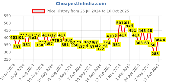 The current price is ₹384, which is ₹96 (33.3%) higher than the best price of ₹288 last seen on 27 Jul 2025. Over the 447 day price history period, prices have ranged from ₹288 to ₹501, with an average of ₹386. The pricing shows moderate volatility, with prices remaining relatively stable overall. In terms of recent activity, there have been 0 price changes this week, 0 this month, and 12 over the past year. If you need this product now, it's a reasonable time to buy as prices are stable, but you might want to monitor for potential better deals.