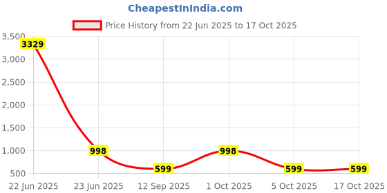 Good news! The current price of ₹599 is at its best ever level. Over the 116 day price history period, prices have ranged from ₹599 to ₹3,329, with an average of ₹1,187. The pricing shows high volatility with significant fluctuations, and the overall trend is favorable for consumers as prices are getting cheaper. In terms of recent activity, there have been 0 price changes this week, 1 this month, and 4 over the past year. This is an excellent time to make a purchase as prices are trending downward and conditions appear favorable.