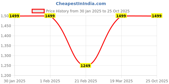 The current price is ₹1,499, which is ₹249.5 (20.0%) higher than the best price of ₹1,249.5 last seen on 21 Feb 2025. Over the 267 day price history period, prices have ranged from ₹1,249.5 to ₹1,499.4, with an average of ₹1,449. The pricing shows moderate volatility, with prices remaining relatively stable overall. In terms of recent activity, there have been 0 price changes this week, 0 this month, and 3 over the past year. The price direction is uncertain, so monitor the situation for a few more days before making a decision.