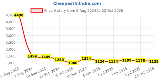 The current price is ₹1,125, which is ₹125 (12.5%) higher than the best price of ₹1,000 last seen on 5 Oct 2024. Over the 447 day price history period, prices have ranged from ₹1,000 to ₹4,498, with an average of ₹1,524. The pricing shows high volatility with significant fluctuations, and the overall trend is favorable for consumers as prices are getting cheaper. In terms of recent activity, there have been 0 price changes this week, 0 this month, and 5 over the past year. If you need this product now, it's a reasonable time to buy as prices are stable, but you might want to monitor for potential better deals.