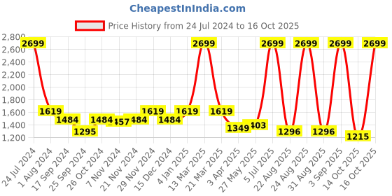 Good news! The current price of ₹1,215 is at its best ever level. Over the 447 day price history period, prices have ranged from ₹1,215 to ₹2,699, with an average of ₹1,761. The pricing shows high volatility with significant fluctuations, and the overall trend is favorable for consumers as prices are getting cheaper. In terms of recent activity, there have been 0 price changes this week, 0 this month, and 15 over the past year. If you need this product now, it's a reasonable time to buy as prices are stable, but you might want to monitor for potential better deals.