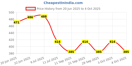 Great news for shoppers! The current price of ₹385 is at its best ever level. Over the 106 day price history period, prices have ranged from ₹385 to ₹488, with an average of ₹427. The pricing shows moderate volatility, and the overall trend is favorable for consumers as prices are getting cheaper. In terms of recent activity, there have been 0 price changes this week, 3 this month, and 8 over the past year. If you need this product now, it's a reasonable time to buy as prices are stable, but you might want to monitor for potential better deals.