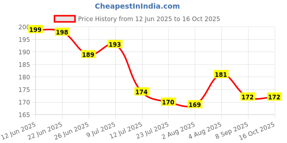 The current price is ₹172, which is ₹3 (1.8%) higher than the best price of ₹169 last seen on 2 Aug 2025. Over the 126 day price history period, prices have ranged from ₹169 to ₹199, with an average of ₹182. The pricing shows moderate volatility, and the overall trend is favorable for consumers as prices are getting cheaper. In terms of recent activity, there have been 0 price changes this week, 0 this month, and 8 over the past year. If you need this product now, it's a reasonable time to buy as prices are stable, but you might want to monitor for potential better deals.