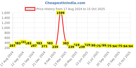 The current price is ₹264, which is ₹25 (10.5%) higher than the best price of ₹239 last seen on 9 Feb 2025. Over the 424 day price history period, prices have ranged from ₹239 to ₹1,599, with an average of ₹363. The pricing shows high volatility with significant fluctuations, and the overall trend is favorable for consumers as prices are getting cheaper. In terms of recent activity, there have been 0 price changes this week, 4 this month, and 16 over the past year. If you need this product now, it's a reasonable time to buy as prices are stable, but you might want to monitor for potential better deals.