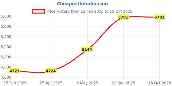 The current price is ₹5,781, which is ₹1,057.05 (22.4%) higher than the best price of ₹4,723.95 last seen on 15 Feb 2025. Over the 241 day price history period, prices have ranged from ₹4,723.95 to ₹5,781, with an average of ₹5,231. The pricing shows moderate volatility, but the overall trend is concerning as prices are getting more expensive. In terms of recent activity, there have been 0 price changes this week, 0 this month, and 3 over the past year. Consider waiting before making a purchase as prices are rising and better deals may be available later.