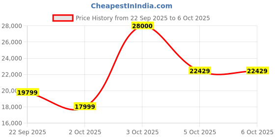 The current price is ₹22,429, which is ₹4,430 (24.6%) higher than the best price of ₹17,999 last seen on 2 Oct 2025. Over the 13 day price history period, prices have ranged from ₹17,999 to ₹28,000, with an average of ₹22,131. The pricing shows high volatility with significant fluctuations, but the overall trend is concerning as prices are getting more expensive. In terms of recent activity, there have been 2 price changes this week, 3 this month, and 3 over the past year. The price direction is uncertain, so monitor the situation for a few more days before making a decision.