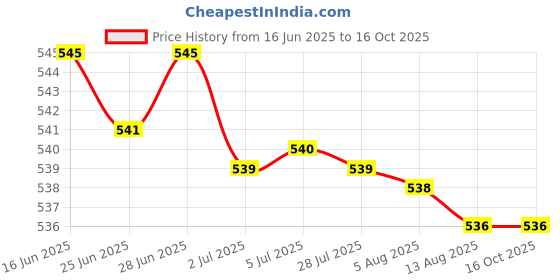 Awesome! The current price of ₹536 is at its best ever level. Over the 122 day price history period, prices have ranged from ₹536 to ₹545, with an average of ₹540. The pricing has been quite stable with low volatility, with prices remaining relatively stable overall. In terms of recent activity, there have been 0 price changes this week, 0 this month, and 7 over the past year. If you need this product now, it's a reasonable time to buy as prices are stable, but you might want to monitor for potential better deals.
