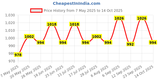 The current price is ₹994, which is ₹16 (1.6%) higher than the best price of ₹978 last seen on 7 May 2025. Over the 160 day price history period, prices have ranged from ₹978 to ₹1,026, with an average of ₹1,002. The pricing has been quite stable with low volatility, with prices remaining relatively stable overall. In terms of recent activity, there have been 0 price changes this week, 1 this month, and 12 over the past year. If you need this product now, it's a reasonable time to buy as prices are stable, but you might want to monitor for potential better deals.