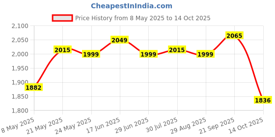 Awesome! The current price of ₹1,836 is at its best ever level. Over the 159 day price history period, prices have ranged from ₹1,836 to ₹2,065, with an average of ₹1,984. The pricing has been quite stable with low volatility, with prices remaining relatively stable overall. In terms of recent activity, there have been 0 price changes this week, 1 this month, and 8 over the past year. The price direction is uncertain, so monitor the situation for a few more days before making a decision.