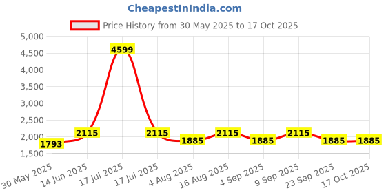 The current price is ₹1,885, which is ₹92 (5.1%) higher than the best price of ₹1,793 last seen on 30 May 2025. Over the 139 day price history period, prices have ranged from ₹1,793 to ₹4,599, with an average of ₹2,239. The pricing shows high volatility with significant fluctuations, but the overall trend is concerning as prices are getting more expensive. In terms of recent activity, there have been 0 price changes this week, 0 this month, and 8 over the past year. The price direction is uncertain, so monitor the situation for a few more days before making a decision.