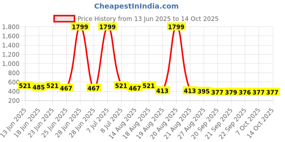 The current price is ₹377, which is ₹1 (0.3%) higher than the best price of ₹376 last seen on 22 Sep 2025. Over the 122 day price history period, prices have ranged from ₹376 to ₹1,799, with an average of ₹657. The pricing shows high volatility with significant fluctuations, and the overall trend is favorable for consumers as prices are getting cheaper. In terms of recent activity, there have been 0 price changes this week, 3 this month, and 17 over the past year. If you need this product now, it's a reasonable time to buy as prices are stable, but you might want to monitor for potential better deals.