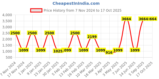 The current price is ₹3,664, which is ₹2,748 (300.0%) higher than the best price of ₹916 last seen on 3 Apr 2025. Over the 343 day price history period, prices have ranged from ₹916 to ₹3,664, with an average of ₹1,931. The pricing shows high volatility with significant fluctuations, but the overall trend is concerning as prices are getting more expensive. In terms of recent activity, there have been 0 price changes this week, 0 this month, and 15 over the past year. Consider waiting before making a purchase as prices are rising and better deals may be available later.