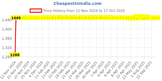 The current price is ₹1,448, which is ₹160 (12.4%) higher than the best price of ₹1,288 last seen on 12 Nov 2024. Over the 338 day price history period, prices have ranged from ₹1,288 to ₹1,453, with an average of ₹1,448. The pricing has been quite stable with low volatility, but the overall trend is concerning as prices are getting more expensive. In terms of recent activity, there have been 0 price changes this week, 7 this month, and 143 over the past year. If you need this product now, it's a reasonable time to buy as prices are stable, but you might want to monitor for potential better deals.