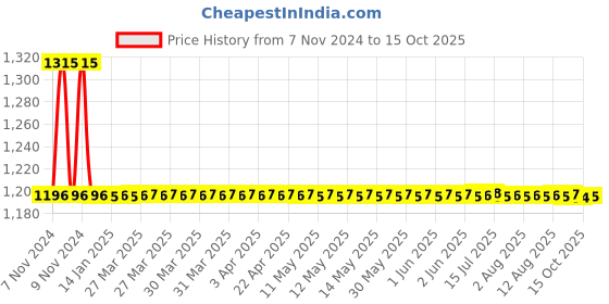The current price is ₹1,195, which is ₹1 (0.1%) higher than the best price of ₹1,194 last seen on 25 Sep 2025. Over the 342 day price history period, prices have ranged from ₹1,194 to ₹1,315, with an average of ₹1,200. The pricing has been quite stable with low volatility, with prices remaining relatively stable overall. In terms of recent activity, there have been 0 price changes this week, 1 this month, and 54 over the past year. If you need this product now, it's a reasonable time to buy as prices are stable, but you might want to monitor for potential better deals.