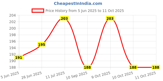 Great news for shoppers! The current price of ₹188 is at its best ever level. Over the 127 day price history period, prices have ranged from ₹188 to ₹203, with an average of ₹195. The pricing has been quite stable with low volatility, with prices remaining relatively stable overall. In terms of recent activity, there has been 1 price change this week, 1 this month, and 5 over the past year. If you need this product now, it's a reasonable time to buy as prices are stable, but you might want to monitor for potential better deals.