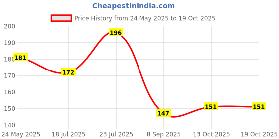 The current price is ₹151, which is ₹4 (2.7%) higher than the best price of ₹147 last seen on 8 Sep 2025. Over the 147 day price history period, prices have ranged from ₹147 to ₹196, with an average of ₹166. The pricing shows moderate volatility, and the overall trend is favorable for consumers as prices are getting cheaper. In terms of recent activity, there have been 0 price changes this week, 0 this month, and 4 over the past year. If you need this product now, it's a reasonable time to buy as prices are stable, but you might want to monitor for potential better deals.