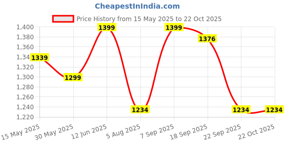Exciting update! The current price of ₹1,234 is at its best ever level. Over the 159 day price history period, prices have ranged from ₹1,234 to ₹1,399, with an average of ₹1,314. The pricing shows moderate volatility, and the overall trend is favorable for consumers as prices are getting cheaper. In terms of recent activity, there have been 0 price changes this week, 0 this month, and 6 over the past year. This is an excellent time to make a purchase as prices are trending downward and conditions appear favorable.