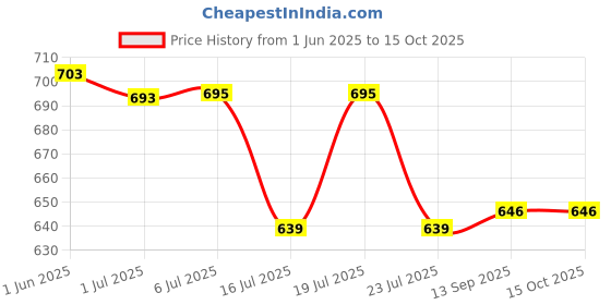 The current price is ₹646, which is ₹7 (1.1%) higher than the best price of ₹639 last seen on 16 Jul 2025. Over the 136 day price history period, prices have ranged from ₹639 to ₹703, with an average of ₹670. The pricing has been quite stable with low volatility, and the overall trend is favorable for consumers as prices are getting cheaper. In terms of recent activity, there have been 0 price changes this week, 0 this month, and 6 over the past year. If you need this product now, it's a reasonable time to buy as prices are stable, but you might want to monitor for potential better deals.