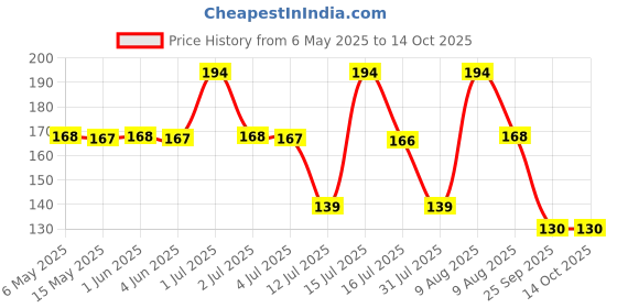 Fantastic! The current price of ₹130 is at its best ever level. Over the 160 day price history period, prices have ranged from ₹130 to ₹194, with an average of ₹164. The pricing shows moderate volatility, and the overall trend is favorable for consumers as prices are getting cheaper. In terms of recent activity, there have been 0 price changes this week, 0 this month, and 13 over the past year. If you need this product now, it's a reasonable time to buy as prices are stable, but you might want to monitor for potential better deals.