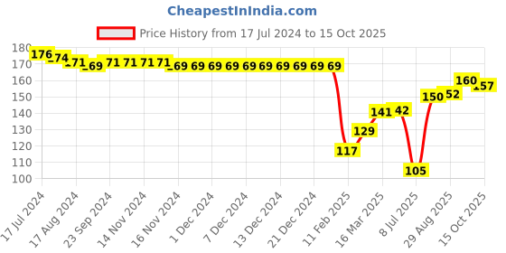 The current price is ₹157, which is ₹52 (49.5%) higher than the best price of ₹105 last seen on 8 Jul 2025. Over the 455 day price history period, prices have ranged from ₹105 to ₹176.79, with an average of ₹160. The pricing shows moderate volatility, and the overall trend is favorable for consumers as prices are getting cheaper. In terms of recent activity, there have been 0 price changes this week, 0 this month, and 21 over the past year. If you need this product now, it's a reasonable time to buy as prices are stable, but you might want to monitor for potential better deals.