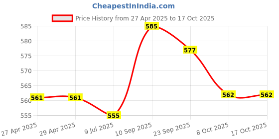 The current price is ₹562, which is ₹7 (1.3%) higher than the best price of ₹555 last seen on 9 Jul 2025. Over the 172 day price history period, prices have ranged from ₹555 to ₹585, with an average of ₹566. The pricing has been quite stable with low volatility, with prices remaining relatively stable overall. In terms of recent activity, there have been 0 price changes this week, 1 this month, and 5 over the past year. If you need this product now, it's a reasonable time to buy as prices are stable, but you might want to monitor for potential better deals.