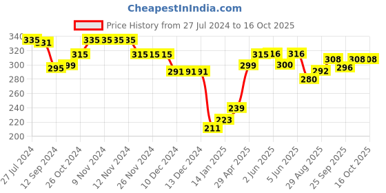 The current price is ₹308, which is ₹96.53 (45.6%) higher than the best price of ₹211.47 last seen on 25 Dec 2024. Over the 446 day price history period, prices have ranged from ₹211.47 to ₹335.16, with an average of ₹302. The pricing shows moderate volatility, and the overall trend is favorable for consumers as prices are getting cheaper. In terms of recent activity, there have been 0 price changes this week, 1 this month, and 23 over the past year. If you need this product now, it's a reasonable time to buy as prices are stable, but you might want to monitor for potential better deals.