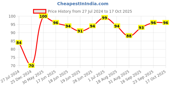 The current price is ₹96, which is ₹25.97 (37.1%) higher than the best price of ₹70.03 last seen on 25 Dec 2024. Over the 446 day price history period, prices have ranged from ₹70.03 to ₹100, with an average of ₹92. The pricing shows moderate volatility, but the overall trend is concerning as prices are getting more expensive. In terms of recent activity, there have been 0 price changes this week, 0 this month, and 10 over the past year. If you need this product now, it's a reasonable time to buy as prices are stable, but you might want to monitor for potential better deals.