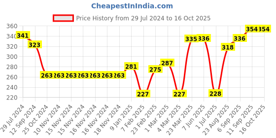 The current price is ₹354, which is ₹126.38 (55.5%) higher than the best price of ₹227.62 last seen on 7 Feb 2025. Over the 444 day price history period, prices have ranged from ₹227.62 to ₹354, with an average of ₹289. The pricing shows moderate volatility, with prices remaining relatively stable overall. In terms of recent activity, there have been 0 price changes this week, 0 this month, and 17 over the past year. If you need this product now, it's a reasonable time to buy as prices are stable, but you might want to monitor for potential better deals.