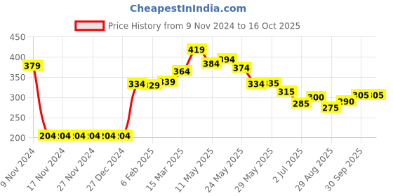 The current price is ₹305, which is ₹101 (49.5%) higher than the best price of ₹204 last seen on 12 Nov 2024. Over the 341 day price history period, prices have ranged from ₹204 to ₹419.16, with an average of ₹304. The pricing shows high volatility with significant fluctuations, and the overall trend is favorable for consumers as prices are getting cheaper. In terms of recent activity, there have been 0 price changes this week, 0 this month, and 22 over the past year. If you need this product now, it's a reasonable time to buy as prices are stable, but you might want to monitor for potential better deals.