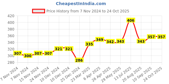 The current price is ₹357, which is ₹70.41 (24.6%) higher than the best price of ₹286.59 last seen on 25 Dec 2024. Over the 351 day price history period, prices have ranged from ₹286.59 to ₹406, with an average of ₹332. The pricing shows moderate volatility, but the overall trend is concerning as prices are getting more expensive. In terms of recent activity, there have been 0 price changes this week, 0 this month, and 13 over the past year. If you need this product now, it's a reasonable time to buy as prices are stable, but you might want to monitor for potential better deals.