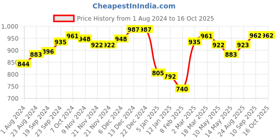 The current price is ₹962, which is ₹221.57 (29.9%) higher than the best price of ₹740.43 last seen on 8 Feb 2025. Over the 441 day price history period, prices have ranged from ₹740.43 to ₹987.24, with an average of ₹911. The pricing shows moderate volatility, but the overall trend is concerning as prices are getting more expensive. In terms of recent activity, there have been 0 price changes this week, 0 this month, and 14 over the past year. If you need this product now, it's a reasonable time to buy as prices are stable, but you might want to monitor for potential better deals.