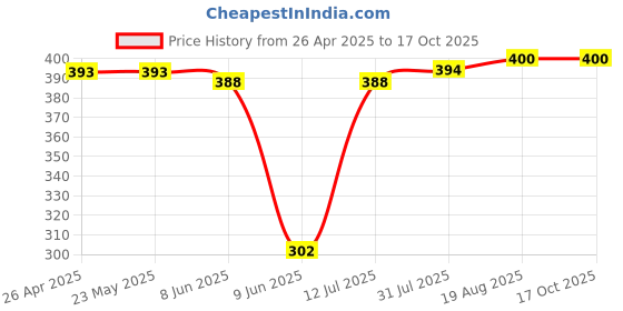 The current price is ₹400, which is ₹98 (32.5%) higher than the best price of ₹302 last seen on 9 Jun 2025. Over the 173 day price history period, prices have ranged from ₹302 to ₹400, with an average of ₹382. The pricing shows moderate volatility, with prices remaining relatively stable overall. In terms of recent activity, there have been 0 price changes this week, 0 this month, and 6 over the past year. If you need this product now, it's a reasonable time to buy as prices are stable, but you might want to monitor for potential better deals.