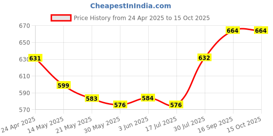 The current price is ₹664, which is ₹88 (15.3%) higher than the best price of ₹576 last seen on 30 May 2025. Over the 174 day price history period, prices have ranged from ₹576 to ₹664, with an average of ₹612. The pricing shows moderate volatility, but the overall trend is concerning as prices are getting more expensive. In terms of recent activity, there have been 0 price changes this week, 0 this month, and 7 over the past year. If you need this product now, it's a reasonable time to buy as prices are stable, but you might want to monitor for potential better deals.