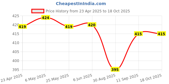 The current price is ₹415, which is ₹20 (5.1%) higher than the best price of ₹395 last seen on 30 Aug 2025. Over the 178 day price history period, prices have ranged from ₹395 to ₹424.15, with an average of ₹415. The pricing has been quite stable with low volatility, with prices remaining relatively stable overall. In terms of recent activity, there have been 0 price changes this week, 0 this month, and 5 over the past year. If you need this product now, it's a reasonable time to buy as prices are stable, but you might want to monitor for potential better deals.