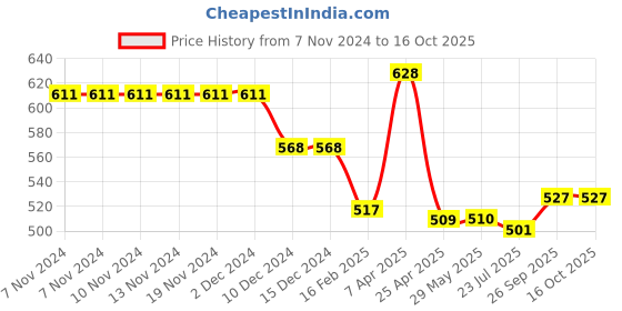 The current price is ₹527, which is ₹26 (5.2%) higher than the best price of ₹501 last seen on 23 Jul 2025. Over the 343 day price history period, prices have ranged from ₹501 to ₹628.26, with an average of ₹568. The pricing shows moderate volatility, and the overall trend is favorable for consumers as prices are getting cheaper. In terms of recent activity, there have been 0 price changes this week, 0 this month, and 13 over the past year. If you need this product now, it's a reasonable time to buy as prices are stable, but you might want to monitor for potential better deals.
