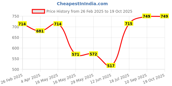 The current price is ₹749, which is ₹232 (44.9%) higher than the best price of ₹517 last seen on 12 Jun 2025. Over the 234 day price history period, prices have ranged from ₹517 to ₹749, with an average of ₹665. The pricing shows moderate volatility, with prices remaining relatively stable overall. In terms of recent activity, there have been 0 price changes this week, 0 this month, and 7 over the past year. If you need this product now, it's a reasonable time to buy as prices are stable, but you might want to monitor for potential better deals.