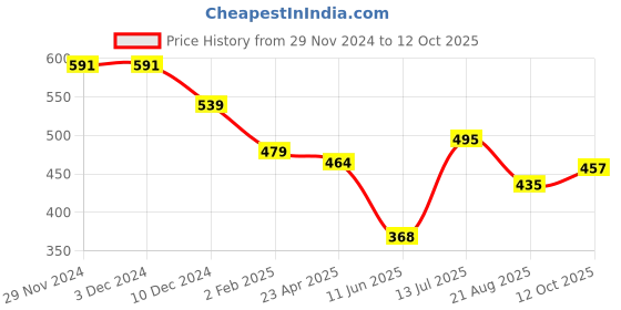 The current price is ₹457, which is ₹89 (24.2%) higher than the best price of ₹368 last seen on 11 Jun 2025. Over the 317 day price history period, prices have ranged from ₹368 to ₹591.71, with an average of ₹491. The pricing shows moderate volatility, and the overall trend is favorable for consumers as prices are getting cheaper. In terms of recent activity, there have been 0 price changes this week, 0 this month, and 8 over the past year. If you need this product now, it's a reasonable time to buy as prices are stable, but you might want to monitor for potential better deals.