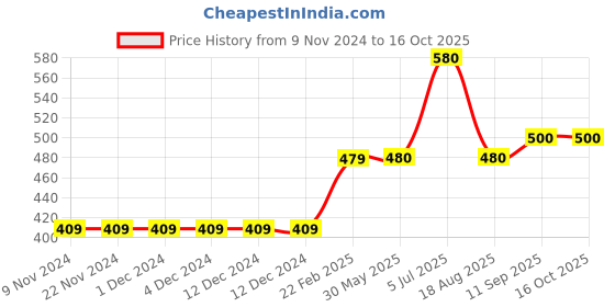The current price is ₹500, which is ₹91 (22.2%) higher than the best price of ₹409 last seen on 9 Nov 2024. Over the 341 day price history period, prices have ranged from ₹409 to ₹580, with an average of ₹456. The pricing shows moderate volatility, but the overall trend is concerning as prices are getting more expensive. In terms of recent activity, there have been 0 price changes this week, 0 this month, and 10 over the past year. If you need this product now, it's a reasonable time to buy as prices are stable, but you might want to monitor for potential better deals.