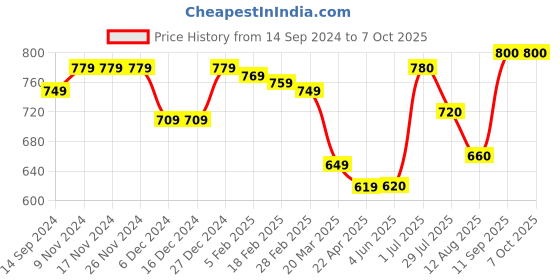 The current price is ₹800, which is ₹180.62 (29.2%) higher than the best price of ₹619.38 last seen on 22 Apr 2025. Over the 387 day price history period, prices have ranged from ₹619.38 to ₹800, with an average of ₹734. The pricing shows moderate volatility, but the overall trend is concerning as prices are getting more expensive. In terms of recent activity, there have been 0 price changes this week, 0 this month, and 15 over the past year. Consider waiting before making a purchase as prices are rising and better deals may be available later.