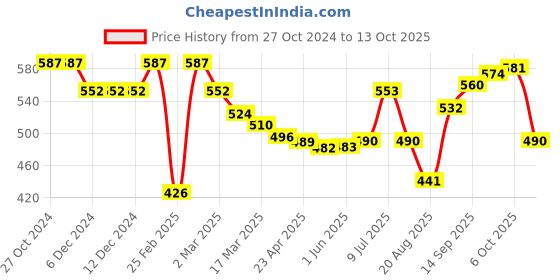 The current price is ₹490, which is ₹63.61 (14.9%) higher than the best price of ₹426.39 last seen on 25 Feb 2025. Over the 351 day price history period, prices have ranged from ₹426.39 to ₹587.16, with an average of ₹528. The pricing shows moderate volatility, and the overall trend is favorable for consumers as prices are getting cheaper. In terms of recent activity, there have been 0 price changes this week, 2 this month, and 23 over the past year. If you need this product now, it's a reasonable time to buy as prices are stable, but you might want to monitor for potential better deals.