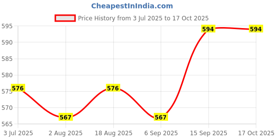 The current price is ₹594, which is ₹27 (4.8%) higher than the best price of ₹567 last seen on 2 Aug 2025. Over the 105 day price history period, prices have ranged from ₹567 to ₹594, with an average of ₹579. The pricing has been quite stable with low volatility, with prices remaining relatively stable overall. In terms of recent activity, there have been 0 price changes this week, 0 this month, and 4 over the past year. If you need this product now, it's a reasonable time to buy as prices are stable, but you might want to monitor for potential better deals.